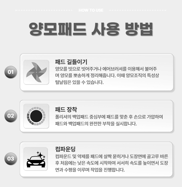 4. 패드에 떡짐현상이 발생할 경우는 약제양이 과다한 경우입니다. 빗이나 에어브러셔로 털어낸 후 사용하십시오 . 이 문제가 지속된다면 컴파운드를 바꾸어 사용해 보십시오.